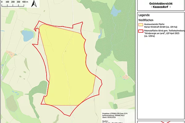 Die Hanse Windkraft GmbH hat einen Antrag zur Errichtung eines Windparks in Kasseedorf gestellt. Grundlage ist die sogenannte Gemeindeöffnungsklausel. Dieses Verfahren läuft bis zum 31.12.2027 oder bis das Land eigene verbindliche Planungen vorlegt. Dazu muss eine Flächennutzungsplanänderung zum Zweck der Errichtung eines Windparks in Kasseedorf beschlossen werden.