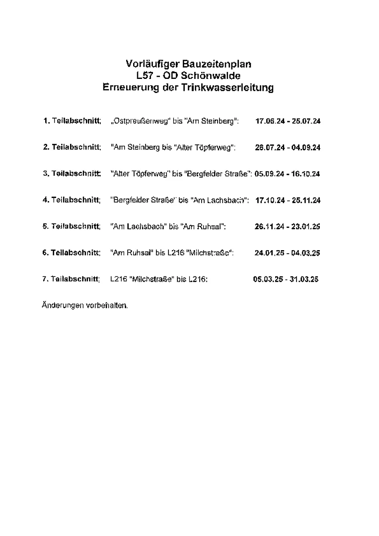Hier sehen Sie den Vorläufigen Bauzeitenplan L57 - OD Schönwalde zur Erneuerung der Trinkwasserleitung.
